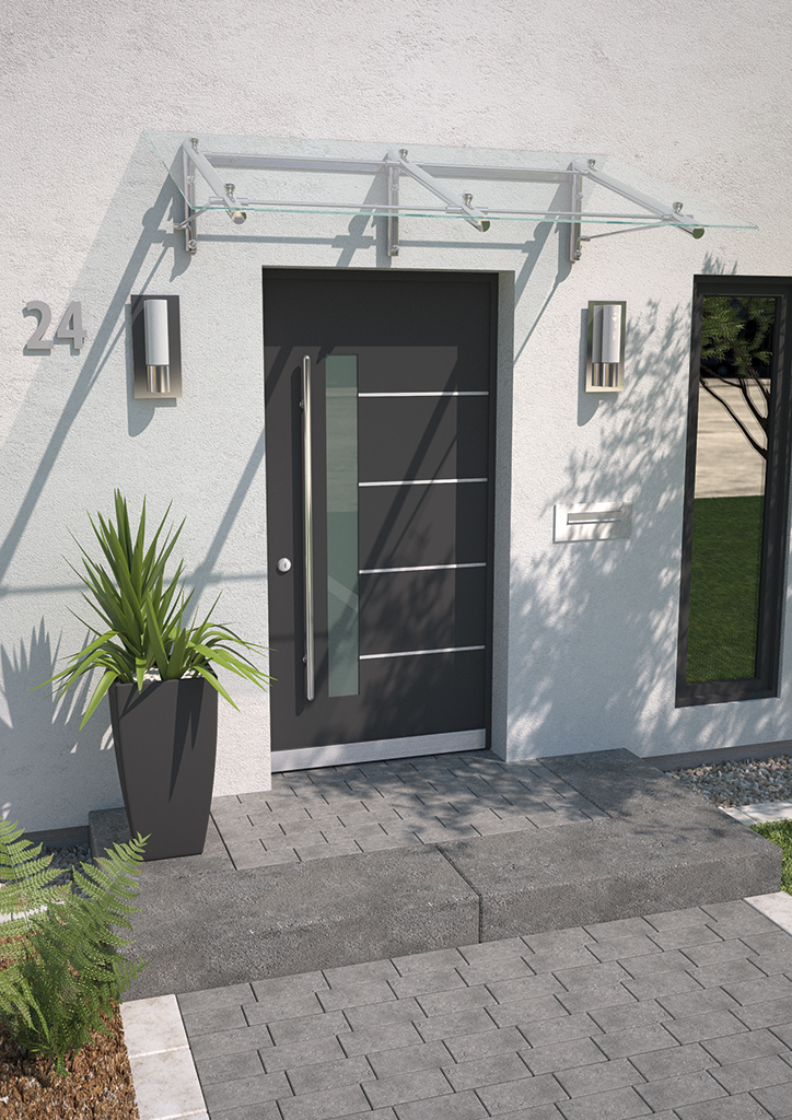 Setzen Sie elegante bauliche Akzente. Individuelle Gestaltungsmöglichkeiten durch diverse Kombinationen und Verglasungsarten erlauben die kreative Personalisierung Ihres Vordachs.